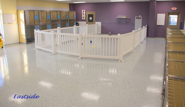 Our Apartment boarding is more of what people expect from traditional boarding. Dogs get their own Apartment (multiple dogs in the same family can share a room), complete wiith a raised Kuranda bed, fleece Purple Pebble mat, and Kong toy. Owners are invited to bring any belongings that will make their pet more comfortable: beds, toys, chew bones, etc. Apartment guests get four outside breaks throughout the day, giving them a chance to stretch their legs, go potty, get attention from the staff, and get a little bit of sunshine.